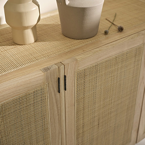 Die Kollektion Maël wollten wir sanft und rund. Diese Kollektion ist von klaren und schlichten Linien geprägt, wie insbesondere unser Buffet aus Mindy-Holz und Rohrgeflecht MAËL. Seine vier fein gewebten Türen aus Naturfasern ermöglichen es Ihnen, Ihr Geschirr und Ihre Haushaltswäsche elegant zu verstauen, die durch das Rohrgeflecht raffiniert sichtbar sind.