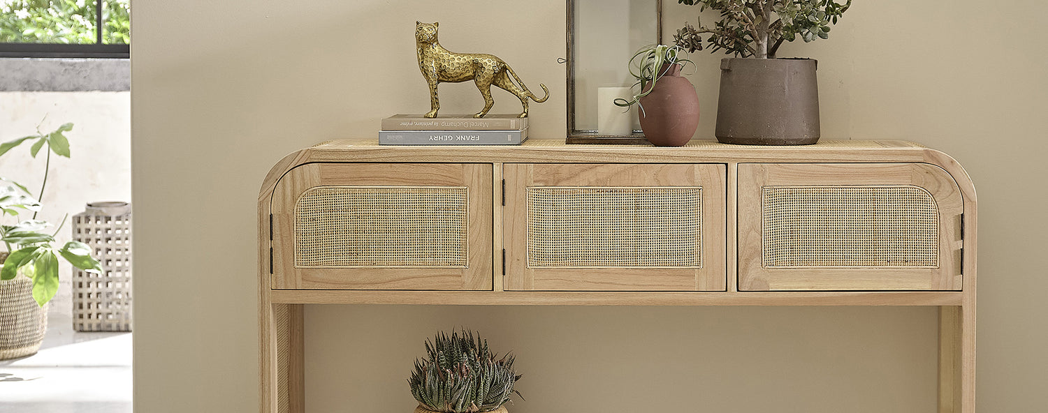 Die Konsole aus Mindyholz und Rohrgeflecht MAËL weicht nicht von der Regel ab: Massives Mindyholz, fein geflochtenes Rohrgeflecht und eine abgerundete Form. So gibt diese Konsole den Ton an: zugleich schlicht, klar und beruhigend. Im Wohnzimmer ist diese Konsole sehr praktisch, um Alltagsgegenstände zu verstauen: Bücher, Akten oder persönliche Dinge. Vergessen Sie nicht, verschiedene Deko-Objekte auszustellen, die Ihnen gefallen oder mit denen Sie gute Erinnerungen verbinden.