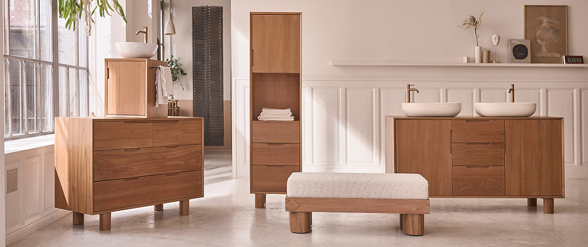 Verschiedene Holzarten (Teak, Mindi, Mangoholz, recyceltes Holz), Dekorationsstile (bohème, skandinavisch, vintage) und Oberflächenbehandlungen (natürlich oder lackiert) – Ihr Glück findet sich sicherlich in einer davon.